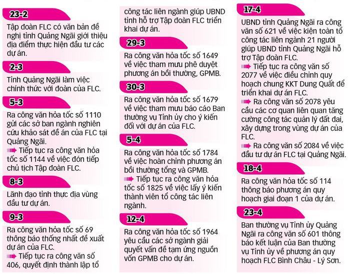 | Từ ngày 5-3 đến 18-4 UBND tỉnh Quảng Ngãi ban hành nhiều công văn, trong đó có 12 công văn hỏa tốc liên quan đến dự án quần thể khu du lịch nghỉ dưỡng và đô thị FLC Bình Châu – Lý Sơn |