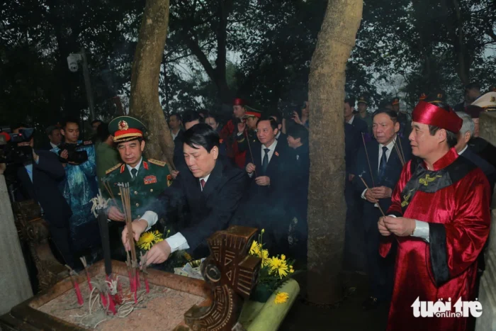 Chủ tịch nước Lương Cường cùng một số lãnh đạo Đảng, Nhà nước và tỉnh Phú Thọ đã kính cẩn thực hiện nghi lễ dâng hương Quốc Tổ trong ngày giỗ Tổ Hùng Vương tại Đền Hùng, tỉnh Phú Thọ.