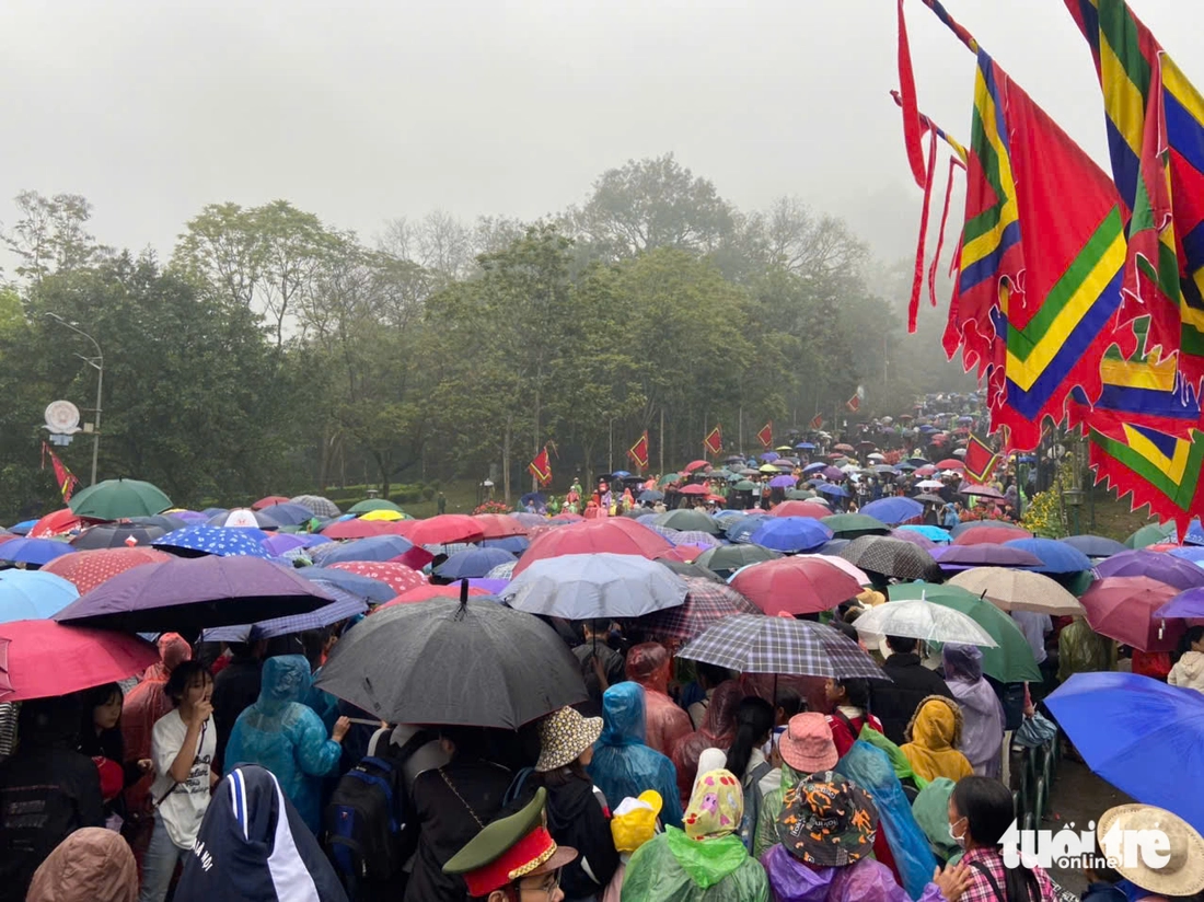 Như thường lệ, hình ảnh quen thuộc là từng đoàn người có cả trẻ con, người già, nam thanh nữ tú cùng nhau hành hương về đất Tổ, bất chấp thời tiết mưa lạnh.