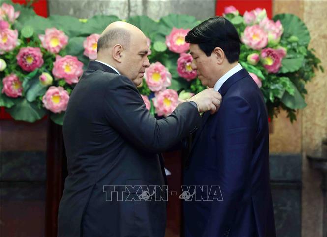 Thủ tướng Liên bang Nga Mikhail Mishustin trao Huân chương Hữu nghị của Nhà nước Liên bang Nga tặng Chủ tịch nước Lương Cường. Ảnh: Phạm Kiên/TTXVN