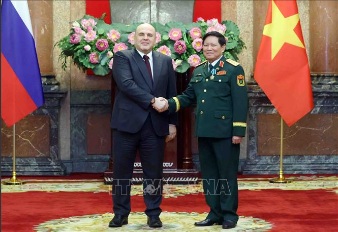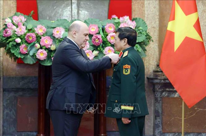 Thủ tướng Liên bang Nga Mikhail Mishustin trao Huân chương Hữu nghị của Nhà nước Liên bang Nga tặng Đại tướng Ngô Xuân Lịch, nguyên Ủy viên Bộ Chính trị, nguyên Bộ trưởng Bộ Quốc phòng. Ảnh: Phạm Kiên/TTXVN