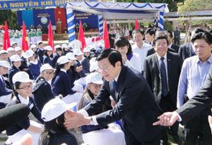Chủ tịch nước Trương Tấn Sang thăm hỏi các em học sinh Trường THPT Bùi Thị Xuân (Lâm Đồng) sáng 3-9. Ảnh: A.Tú |
