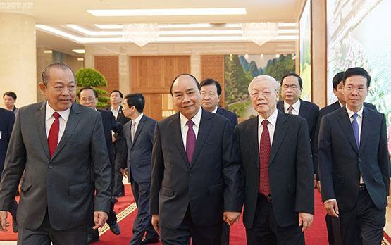 Tổng Bí thư, Chủ tịch nước Nguyễn Phú Trọng, Thủ tướng Nguyễn Xuân Phúc tại phiên khai mạc hội nghị. Ảnh VGP