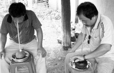 Ông yêu cầu chị A đặt lỗ mũi vào đầu ống tre và hít mạnh, sau đó khì ra lỗ mũi bên kia. Cứ thế, thay đổi lỗ mũi hít vào và khì ra cho đến khi viên thuốc cháy hết… Lần đầu tiên chị A hít theo kiểu này, liên tục bị ngộp thở, nước miếng, nước mũi… tóe ra.