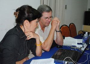 ThS. Ngô Phương Thiện và ThS. Stephen Thomas (thành phần ban giám khảo) căng thẳng chấm video clip của các thí sinh thể hiện |