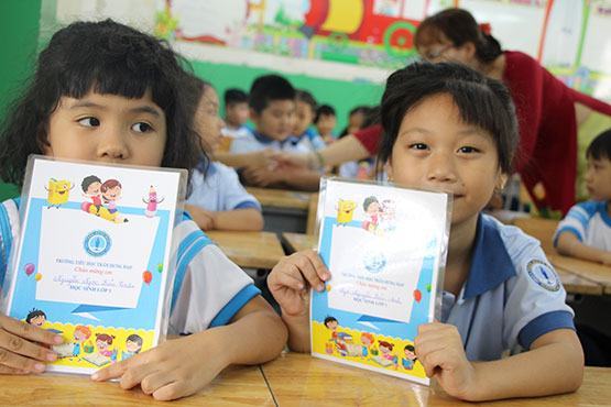 Trong chương trình giáo dc ph thông mi, SGK ch là tài liu đ truyn ti, c th hóa chương trình mi. (Trong hình: HS lp 1 Trưng TH Trn Hưng Đo, Q.1, TP.HCM)