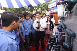 Kỹ sư Cty Bosch đang hướng dẫn sinh viên Trường Cao đẳng Kỹ thuật Cao Thắng sử dụng dụng cụ điện cầm tay. Ảnh: Đ.T.D |