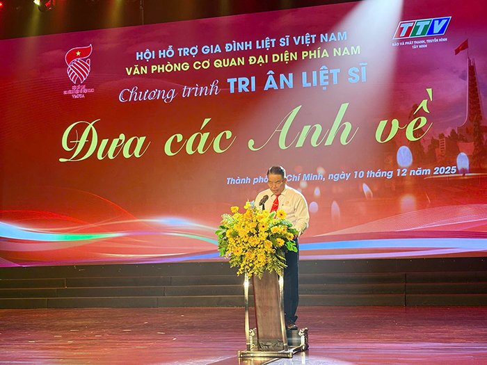Tối 10-12, chương trình tri ân liệt sĩ “Đưa các anh về” được tổ chức tại Nhà hát Quân đội khu vực phía Nam, TP.HCM do Hội Hỗ trợ gia đình liệt sĩ Việt Nam phối hợp cùng các đơn vị liên quan thực hiện. Sự kiện thu hút sự tham dự của nguyên Ủy viên Bộ Chính trị, nguyên Chủ tịch nước Trương Tấn Sang; các đồng chí nguyên lãnh đạo bộ, ngành và địa phương; lãnh đạo Bộ Tư lệnh TP.HCM, Bộ Chỉ huy Quân sự các tỉnh Đồng Nai, Tây Ninh; cùng Mẹ Việt Nam anh hùng Nguyễn Thị Ai.