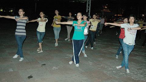 | Dù đã tối mịt nhưng không khí tập luyện chuẩn bị phục vụ trong Đại lễ của các tình nguyện viên sinh viên vẫn khá sôi động. |