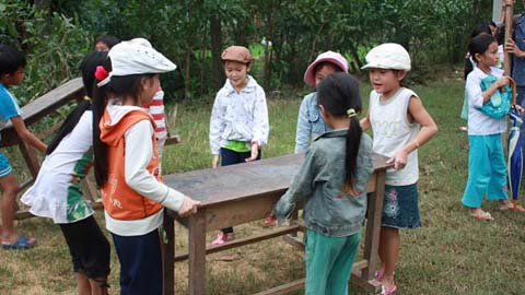 Tiếng cười đùa xen lẫn tiếng bước chân của các em học sinh khi khuân bàn ghế từ ngôi trường sập về nơi học tạm. Không quen công việc, có lúc, em đi tới, em đi giật lùi, có lúc 4 em khiêng bàn ghế đi ngược về 2 hướng, dùng dằng giữa con đường lầy lội. Quãng đường từ ngôi trường tiểu học Sơn Trà đến nơi học tạm là 300 mét, nụ cười ngây thơ khiến nhiều em quên đi cái cảm giác đè nặng trên đôi vai.