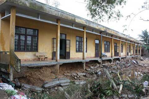 Cách đó không xa, người dân Sơn Trà, tất cả đều tất bật đóng cọc, dồn bao chống lũ. Ngôi trường tiểu học Sơn Trà nằm cạnh con sông Trà Bồng, cơn lũ vừa qua đã khoét sâu vào dưới móng trường, kéo ngôi trường này bị nứt nẻ và có nguy cơ sập đổ bất cứ lúc nào.