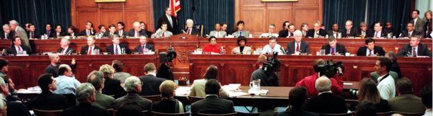 ![]() Quang cảnh phiên bỏ phiếu luận tội Tổng thống Bill Clinton tại Hạ viện Mỹ năm 1998. |