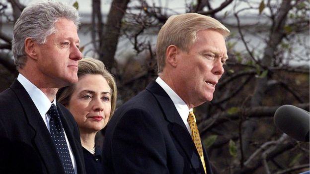 ![]() Khác với ông Trump, tỉ lệ ủng hộ cựu Tổng thống Clinton khi bị đưa ra luận tội rất cao. Trong ảnh, ông Clinton, phu nhân Hillary và Lãnh đạo phe thiểu số Hạ viện Dick Gephardt phát biểu sau khi Tổng thống bị luận tội. |