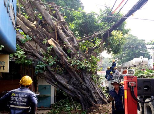 Rạng sáng 1-11, một số công nhân đang đào đường Nơ Trang Long (Q.Bình Thạnh, TP.HCM) để ngầm hóa dây cáp điện, phát hiện cây da to lớn trên vỉa hè, sát nơi thi công, từ từ nghiêng. Sau tiếng “rắc, rắc”, cổ thụ đổ về phía nhà dân nên nhóm công nhân hoảng hốt la lớn, báo động cho hơn chục người trong các căn nhà bỏ chạy ra ngoài. Một lúc sau, cổ thụ bật gốc đổ xuống quán cà phê và quán cơm khiến mái tôn hư hỏng (ảnh). Được biết, cây da cao 20m, đường kính chừng 1m, rễ thòng, bao trùm thân. Do được cắt tỉa thường xuyên nên cây ít cành.