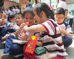 Các em HS Trường TH Điện Biên (Q.10) tràn đầy niềm vui khi được nhận phong bao lì xì từ các bạn Trường TH Nguyễn Bỉnh Khiêm (Q.1)