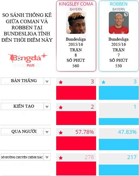 Sau 8 trận ra sân ở Bundesliga mùa này, Coman đã có cho riêng mình 3 bàn thắng, 2 đường kiến tạo, thành công tổng cộng 86% số đường chuyền cùng tỉ lệ qua người khá ấn tượng 57,78%. Các chỉ số này của Coman thậm chí cao hơn so với người đàn anh Robben. Trận gặp Arsenal, mặc dù đã bình phục chấn thương nhưng Robben vẫn phải nhường chỗ cho đàn em suất đá chính. Nên nhớ, Coman mới chỉ có 19 tuổi mà thôi!