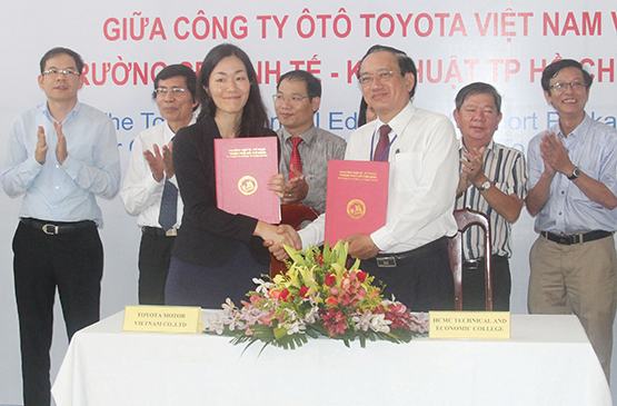 | Ông Phạm Đức Khiêm (Hiệu trưởng Trường CĐ Kinh tế – Kỹ thuật TP.HCM) tiếp nhận gói tài trợ đào tạo kỹ thuật từ đại diện Công ty ô tô Toyota Việt Nam. Ảnh: M.T |