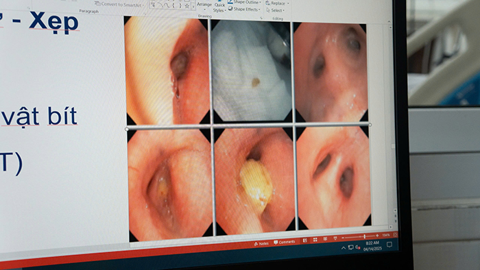 Sau khi tiếp nhận các bác sĩ cấp cứu đã nhanh chóng đặt nội khí quản và chuyển bệnh nhân lên Khoa Hồi sức tích cực chống độc. Các bác sĩ đã tiến hành nội soi phế quản và phát hiện một mảnh xoài nằm ở phế quản gốc bên trái. Dị vật sau đó được lấy ra thành công.