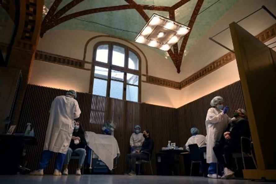 Nhân viên y tế lấy mẫu xét nghiệm nhanh kháng nguyên COVID-19 tại Bệnh viện Santa Creu i Sant Pau ở Barcelona, Tây Ban Nha, ngày 14.12