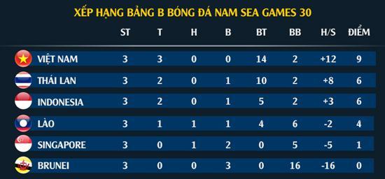 Ngày 1/12, lượt trận thứ ba của bảng B SEA Games 30 đã kết thúc. U22 Thái Lan đánh bại U22 Singapore 3-0, U22 Lào thắng U22 Brunei với tỉ số tương tự trước khi U22 Việt Nam thắng ngược U22 Indonesia với tỉ số 2-1.