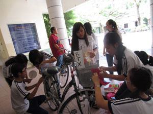 HS trường THPT Bùi Thị Xuân đang trang trí xe đạp (ảnh chụp ngày 22-9). Ảnh: N.Anh