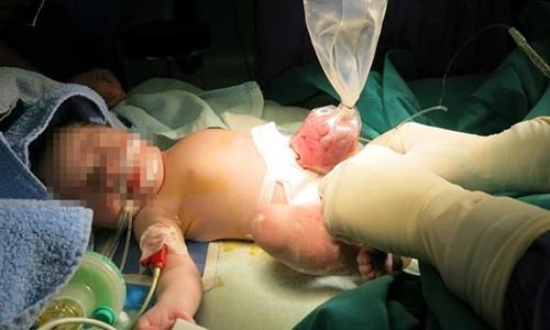 Ngay khi vừa được mổ đưa ra khỏi bụng mẹ, bé Caroline Trần đã được chuyển ngay sang bàn phẫu thuật tiếp theo để xử lý dị tật do toàn bộ nội tạng bé bị nằm ngoài ổ bụng.