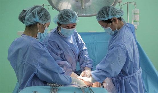 Các BS BV ĐH Y Dược đang phẫu thuật cho sản phụ Đ. Ảnh: BVCC