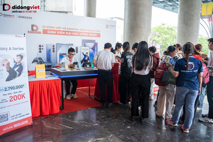 Cùng ngày, tại Đại học Quốc tế Hồng Bàng, Di Động Việt cùng Samsung và Bear tiếp tục đồng hành với chương trình “Career Fair 2025 – Triển lãm, Tuyển dụng và Giao lưu Doanh nghiệp” với khu vực giới thiệu loạt sản phẩm Samsung cùng nhiều hoạt động hấp dẫn.