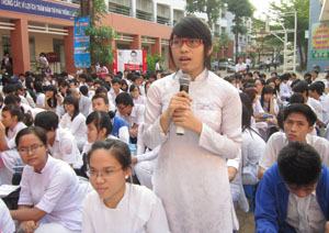 Học sinh Trường THPT Trần Hưng Đạo (TP.HCM) đặt câu hỏi trong chương trình tư vấn tuyển sinh – hướng nghiệp do Báo Giáo Dục TP.HCM tổ chức. Ảnh: Dương Bình