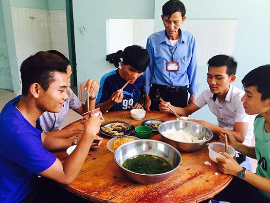 Quản sinh và cấp dưỡng tại điểm thi THPT Phạm Phú Thứ (huyện Hòa Vang chuẩn bị chu đáo bữa cơm miễn phí cho 20 TS đồng bào dân tộc thiểu số, động viên các em tự tin bước vào thi môn tiếng Anh. Đây là năm đầu tiên các TS dân tộc thiểu số ở điểm trường này bắt buộc phải thi môn ngoại ngữ thay vì được thi môn thay thế như các năm trước.