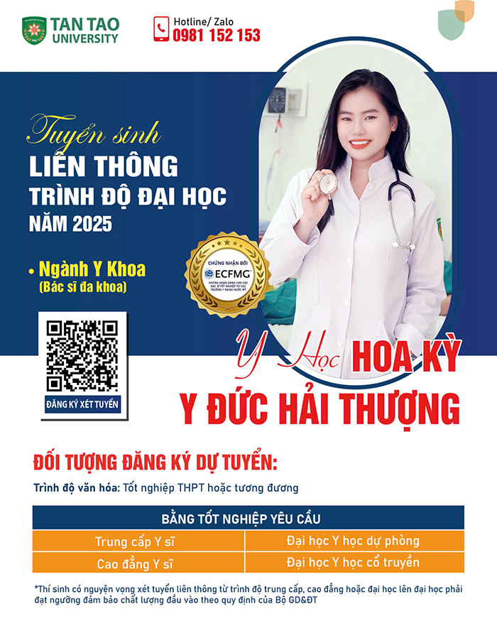 Bên cạnh chương trình đào tạo từ xa, năm 2025 Trường Đại học Tân Tạo tuyển sinh liên thông trình độ đại học ngành Y khoa (Bác sĩ Đa khoa) với phương thức xét tuyển hoặc thi tuyển. Giảm 30% cho sinh viên khóa đầu tiên.