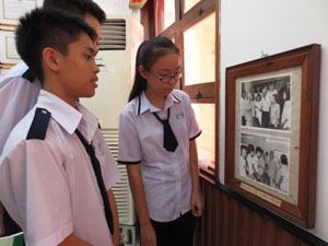 Học sinh Trường THPT Bùi Thị Xuân xem lại hình ảnh Đại tướng Võ Nguyên Giáp về thăm trường