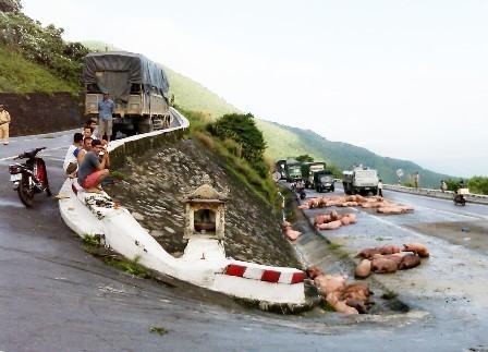 Sáng nay (20/12), tại đèo Hải Vân, địa phận Thị trấn Lăng Cô, huyện Phú Lộc, tỉnh Thừa Thiên – Huế đã xảy ra một vụ tai nạn lật xe tải chở heo làm gần trăm chú heo tràn ra đường đèo gây ách tắt giao thông.