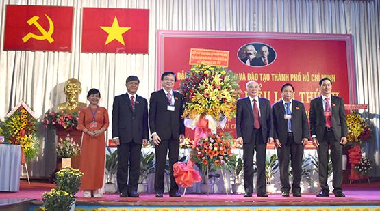 Đồng chí Phan Nguyễn Như Khuê – Trưởng Ban Tuyên Giáo Thành ủy TP.HCM (thứ ba từ phải sang) – đại diện Ban Chấp hành Đảng bộ TP.HCM tặng hoa chúc mừng Đại hội