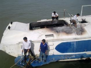 Sau khi trả khách xong (tàu có sức chở tối đa 70 hành khách – PV), các nhân viên tiến hành bơm dầu vào tàu thì phần khoang máy bốc cháy dữ dội.