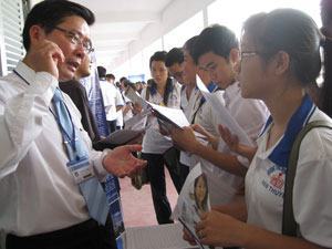 ThS. Nguyễn Anh Đức, Trưởng phòng Công tác Chính trị tư tưởng SV Trường Đại học Sư phạm Kỹ thuật TP.HCM tư vấn cho HS Trường THPT Hàn Thuyên về cách chọn trường, chọn ngành do Báo Giáo Dục TP.HCM tổ chức. Ảnh: Ngọc Anh