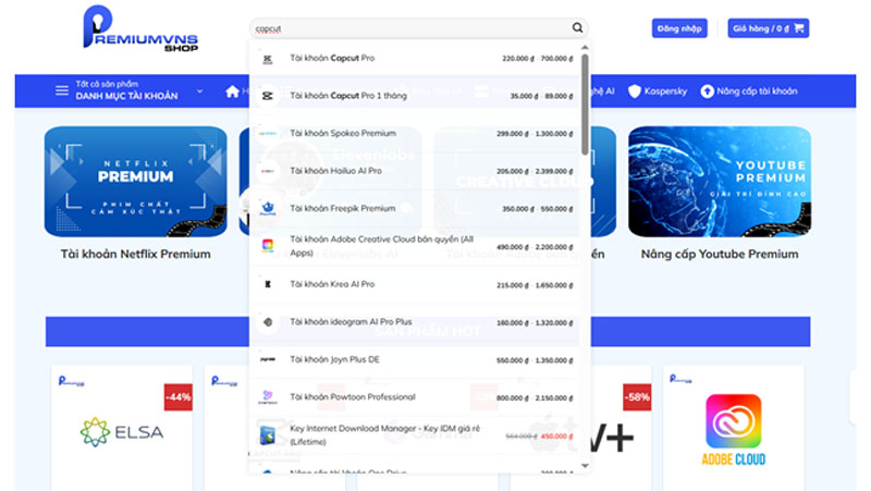 Đầu tiên, hãy vào trang chính thức của Premiumvns Shop – nơi các bạn có thể mua CapCut Pro bản quyền, giá rẻ, uy tín, có bảo hành 1 đổi 1. Tại đây, bạn sẽ thấy nhiều lựa chọn gói CapCut với mức giá ưu đãi phù hợp nhu cầu sử dụng của từng người.