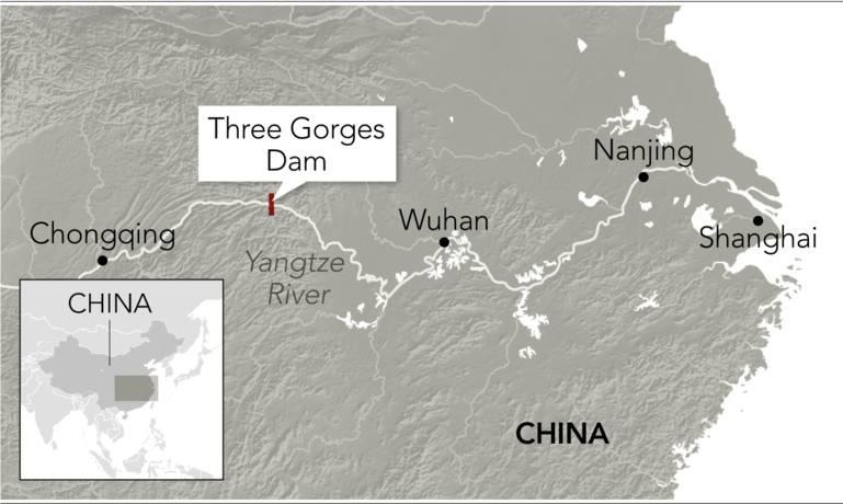 Vị trí của đập Tam Hiệp (Three Gorges Dam) trên sông Dương Tử (Yangtze River) ở Trung Quốc. Các thành phố trên bản đồ gồm Trùng Khánh (Chongqing) ở thượng nguồn đập Tam Hiệp và Vũ Hán (Wuhan), Nam Kinh (Nanjing), Thượng Hải (Shanghai) ở hạ lưu.