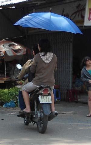 Ngồi trên xe gắn máy, đã không đội mũ bảo hiểm còn… che ô