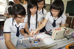Giờ thực hành môn lý của học sinh lớp 12 Trường THPT Bùi Thị Xuân. Ảnh: N.Hùng