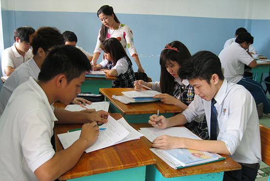 | Giáo viên hướng dẫn HS làm bài trắc nghiệm môn tiếng Anh tại Trường Phổ thông Thái Bình Dương, Cần Thơ. Ảnh: Đ.P |