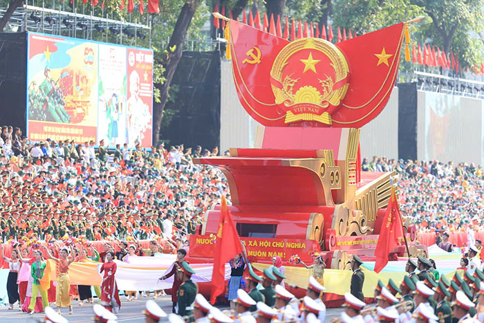 Diễu hành của khối Nghi trượng gồm xe mô hình Quốc huy – khối cờ Đảng, cờ Tổ quốc – xe rước chân dung Chủ tịch Hồ Chí Minh – xe mô hình biểu tượng 50 năm đất nước thống nhất và 12 khối quần chúng.