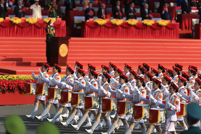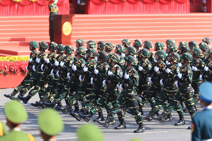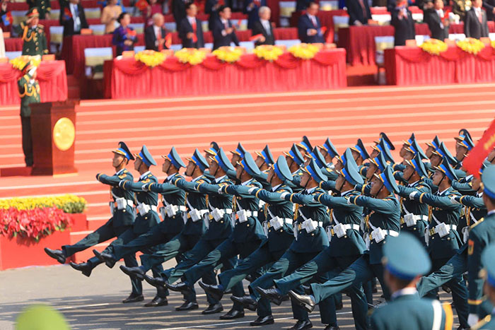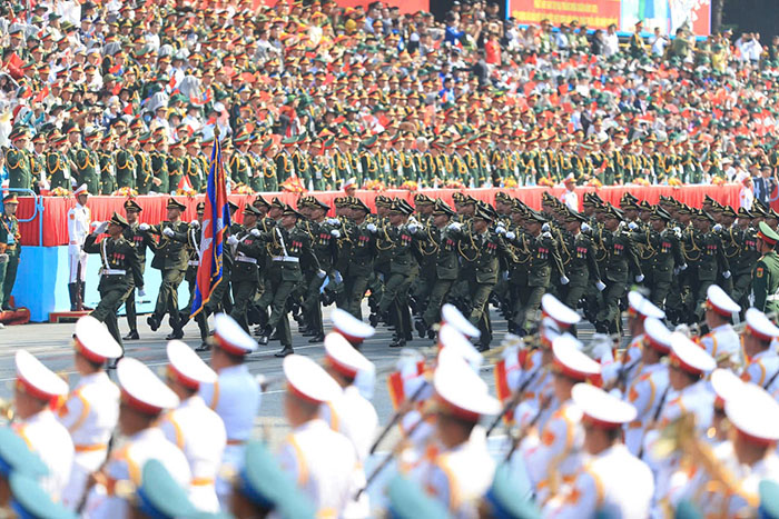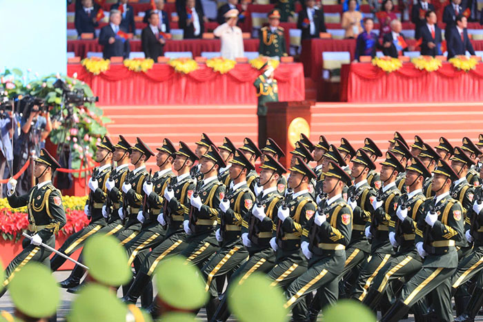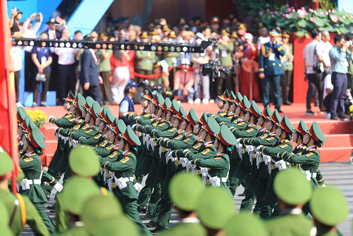 Phần diễu binh, diễu hành có 56 khối tham gia, trong đó có 4 khối xe Nghi trượng, 36 khối diễu hành của Quân đội, Dân quân tự vệ và Công an. Ngoài ra, Khối Quân đội của Lào, Campuchia và Trung Quốc cũng tham gia.