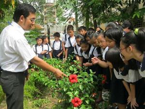 Các em học sinh được giáo viên hướng dẫn tìm hiểu loài hoa dâm bụt. Ảnh: N.Trinh