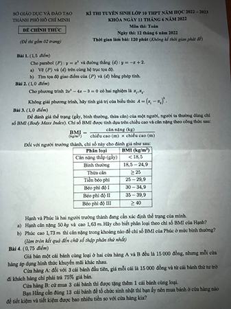 Đề thi Toán tuyển sinh vào lớp 10 TP.HCM năm 2022
