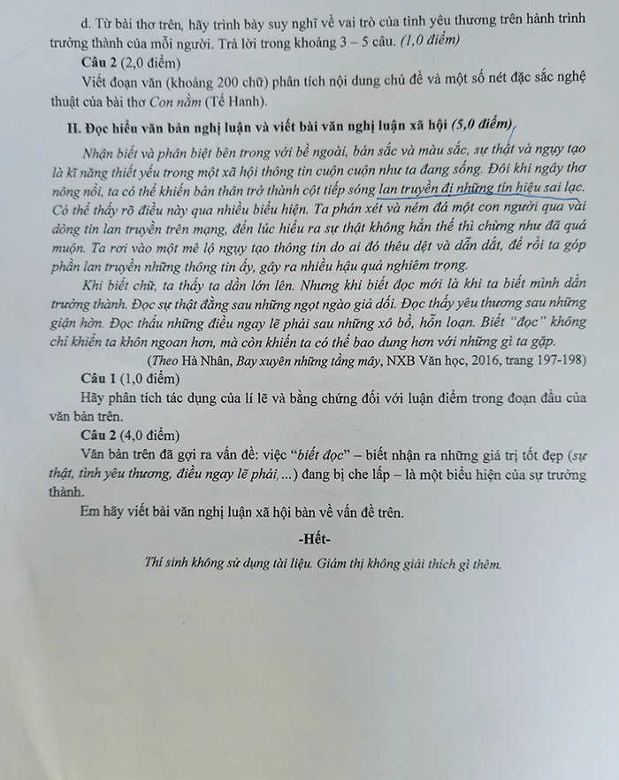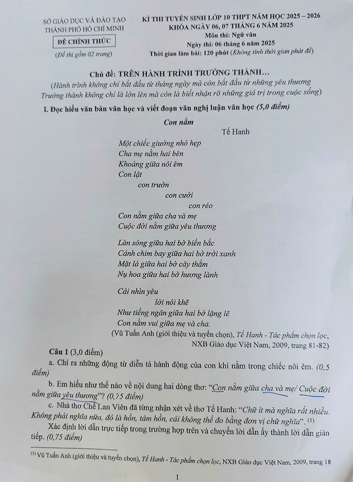 Cụ thể, đề thi tuyển sinh vào lớp 10 TP.HCM môn ngữ văn như sau: