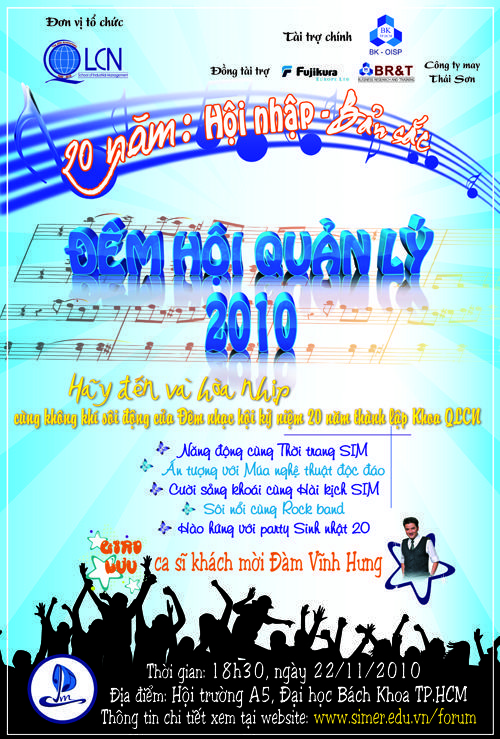 Tối 22/11/2010 tại hội trường A5 – Đại học Bách Khoa TP.HCM sẽ diễn ra “Đêm hội quản lý” với chủ đề “20 NĂM – HỘI NHẬP VÀ BẢN SẮC”của Khoa Quản lý công nghiệp nhân kỷ niệm 20 năm ngày thành lập khoa (26/11/1990 – 26/11/2010).