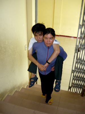 Hằng ngày, hình ảnh người mẹ cõng con nặng nhọc lê từng bước lên cầu thang tầng 3, tầng 4 đã trở nên quen thuộc ở Trường ĐH KHTN TP.HCM |