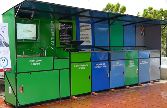 Thứ ba, về quản lý chất thải, trong giai đoạn vừa qua, UEH đã có hơn 75% chương trình thực hiện theo nguyên tắc “Tiết giảm – tái sử dụng – tái chế” và gần 10 chương trình giảm lượng giấy, nhựa thải ra. Đặc biệt trong năm 2024, UEH đã tái chế thành công gần 92% lượng rác thải, khẳng định những nỗ lực của ĐH này trong việc xây dựng khuôn viên học tập xanh, góp phần hình thành thói quen bền vững, tinh thần trách nhiệm với môi trường trong cộng đồng sinh viên. Nổi bật như: Trạm thực hành phân loại rác Go Green Station, ứng dụng nhận diện rác Zeen AI Scan, thùng rác ứng dụng trí tuệ nhân tạo giúp nhận diện và phân loại rác AI Trash Bin, máy thu gom chai nhựa và lon nhôm tự động nhằm phân loại rác thải tại nguồn, đảm bảo cho khuôn viên sạch đẹp. Ngoài ra, UEH còn tích cực kết hợp kiến thức đa ngành, đa lĩnh vực trong thay đổi nhận thức và hành vi sống xanh của cộng đồng.