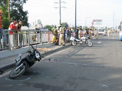 Cú va chạm làm ông Bé ngồi sau ngã vào gầm xe container, bị cán qua người tử vong tại chỗ, anh Ân văng vào thành cầu bị thương nặng. Chiếc xe máy bị vỡ vụn, nằm cách xe container hơn 100 m.